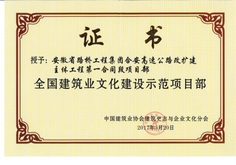 近日,由公司承建的合安高速改擴建主體工程第一合同段項目榮獲首批“全國建筑業(yè)文化建設示范項目部”稱號。該獎項是由中國建筑業(yè)協(xié)會、中建協(xié)建筑史志與企業(yè)文化分會共同評選頒發(fā),首批共授予55個項目“全國建筑業(yè)文化建設示范項目部”稱號。