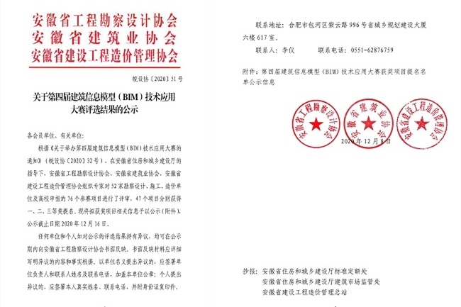 今年,公司依托高新技術(shù)企業(yè)平臺,加大創(chuàng)新力度,進一步提高公司的科技競爭力。課題《城市交通基坑工程施工影響控制與BIM新技術(shù)應用》獲得安徽省公路學會科技進步一等獎;參編的《再生集料道路基層施工技術(shù)規(guī)程》獲批為安徽省地方標準;獲得省部級工法10項,授權(quán)專利10項;申報的《G347安九二期望江至宿松段一級公路工程楊灣河特大橋BIM應用項目》榮獲第五屆中國建設工程BIM大賽單項三類成果、安徽省第四屆建筑信息模型大賽二等獎,選送的《肥西縣產(chǎn)城融合示范區(qū)綜合管廊BIM應用項目》在全國“首屆工程建設行業(yè)BIM大賽”中獲獎。