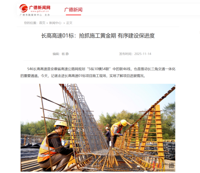 近日,由建工建投集團(tuán)承建的S46長高高速01標(biāo)項(xiàng)目建設(shè)正酣,各項(xiàng)施工工序高效推進(jìn)、有序銜接,為區(qū)域經(jīng)濟(jì)發(fā)展注入強(qiáng)勁動(dòng)能,《安徽日報(bào)》客戶端、廣德新聞網(wǎng)報(bào)道項(xiàng)目建設(shè)動(dòng)態(tài)。